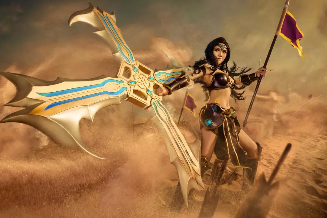 后期出奇迹系列!选手几套作品质量都很高不论是场景选取还是道具制作都颇具苦心,例如希维尔那组作品能真正深入沙漠之中进行拍摄着实不易!然而真正让作品脱胎换骨的因素还是要归功于超神的后期,例如发条魔灵的腰部处理、希维尔飞沙走石的场景、尤其是娜美仿佛游戏原画般的场景,都令人叹为观止!